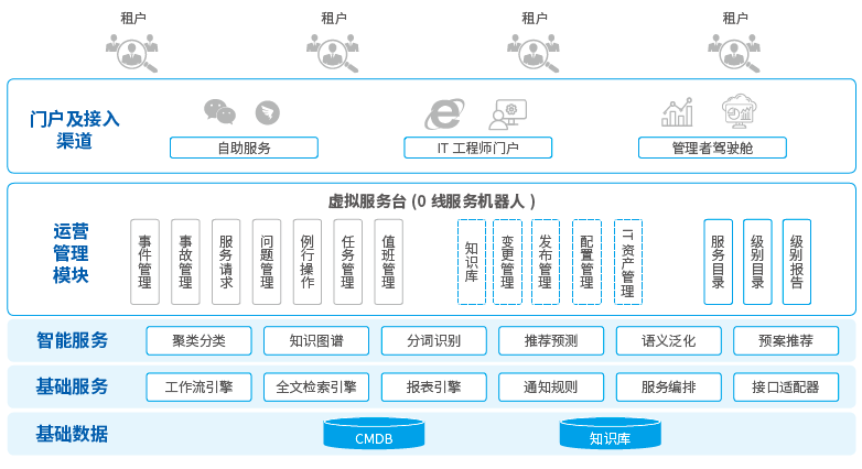 EVO视讯官网信息智能流程自动化运营管理平台,在服务管理过程中嵌入人工智能和自动化技术,顺利获得独特的“虚拟服务台”,实现智能工单分类、告警模式识别、根因分析、智能问答、热点分析、自助化交付等多项功能,建立新一代IT 智能运营管理平台,提高服务交付效率和敏捷性,增强客户满意度,助力金融数字化转型落地。