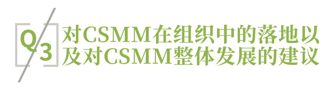 一是希望标准能够关注不同规模、不同类型的企业,因为一个上万IT人员、上千项目的企业,和一两百人的IT企业引入CSMM的方式和启动都是不一样的,如果没有很好的引导,可能会导致大家无从下手。第二点是,希望能够组织更多的研讨培训,让大家能够互通有无,相互学习,也方便大家及时反馈问题。第三点是,CSMM的数据比一般企业要多,希望这些数据能够尽快地发布出来,帮助企业更好、更准确地来认识自己。生态合力,让CSMM助力更多中国软件企业实现高质量开展。