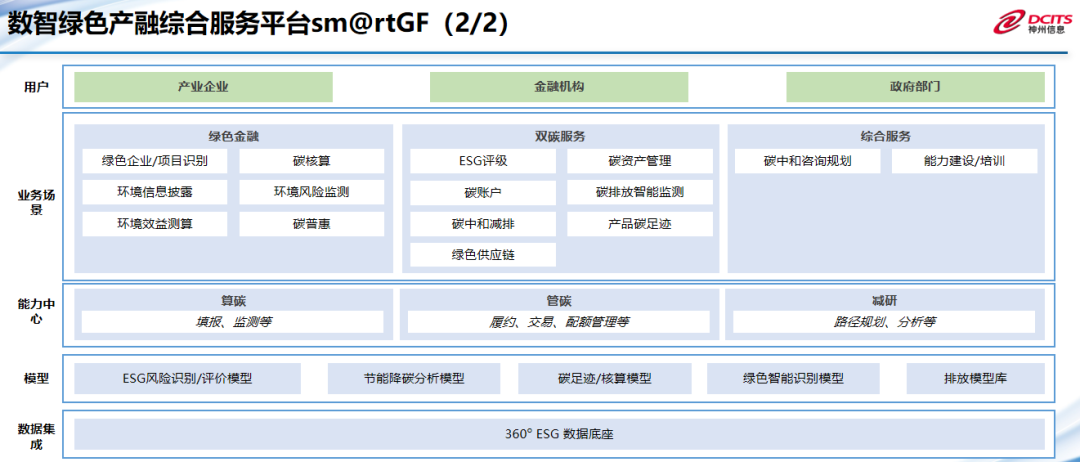 在数据底座,希望能够为政府、企业、金融打通绿色金融相关数据的共享,形成一个全面的绿色数据图谱,从E扩展到S和G,以此反哺绿色产业、绿色金融的可持续开展。